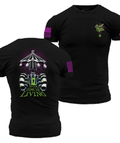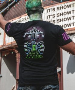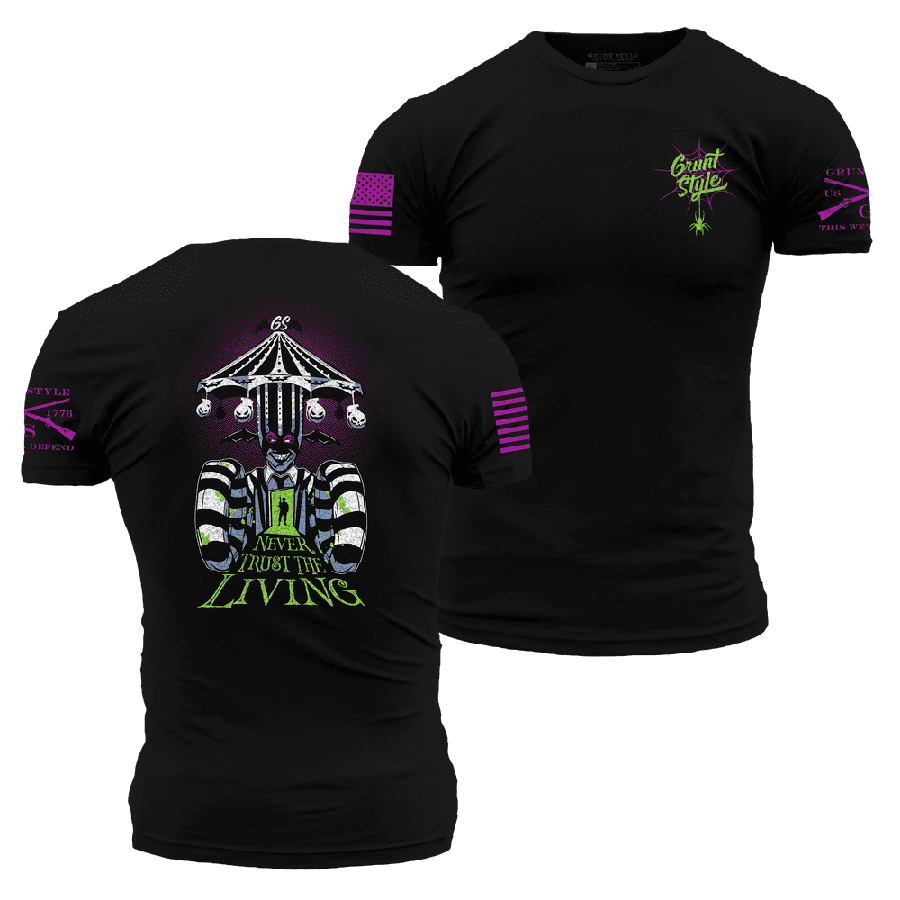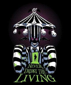 It’s Show Time and this Never Trust The Living T-Shirt is perfect for those who embrace the strange and unusual! This shirt is sure to spook and excite, just don’t say his name three times! This spooky design boasts a badass design that is sure to get noticed and stand out this spooky season.