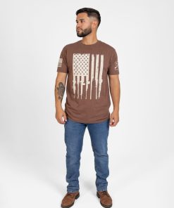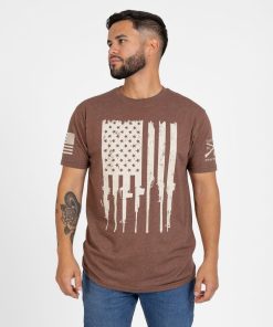 The Rifle Flag T-Shirt in Heather Brown is for the patriots who know liberty is earned and defended. Old Glory is reimagined with rifles for stripes—a bold salute to the Second Amendment and the grit that keeps America free. The rugged heather brown color brings a field-ready, battle-tested edge, while the classic fit makes it a go-to for range days, workdays, and every day in between.
