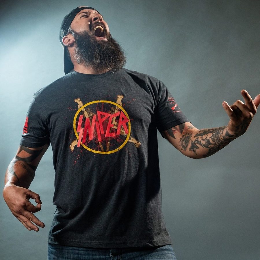 Get ready to rock with precision. The Sniper Tour Grunt Style T-Shirt in Charcoal combines the power of heavy metal with the skill of a sharpshooter. This tee is for those who hit hard and fast, with unmatched accuracy. Channeling the spirit of a sniper on a mission, it cranks the volume to 11 and delivers style and power with every shot.