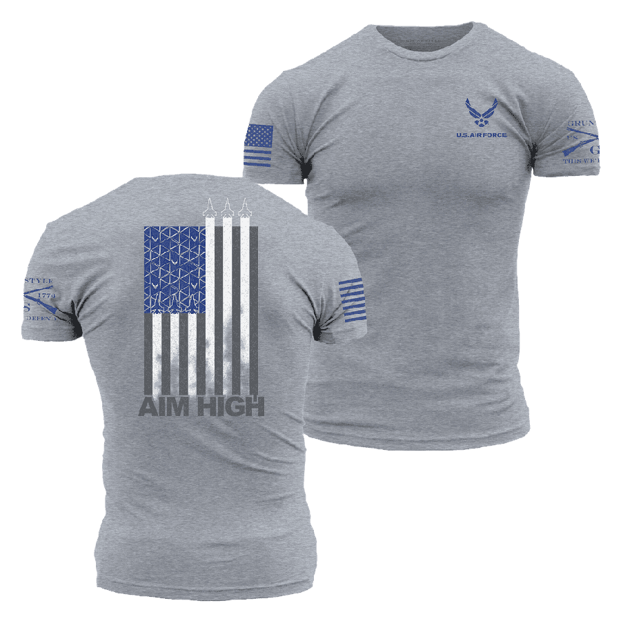 The USAF – Aim High Flag T-Shirt in Dark Heather Gray is a sharp salute to the strength, honor, and legacy of the United States Air Force. With the bold American flag on one sleeve and “Aim High” proudly displayed, this officially licensed tee represents the unwavering commitment of those who fly, fight, and win.